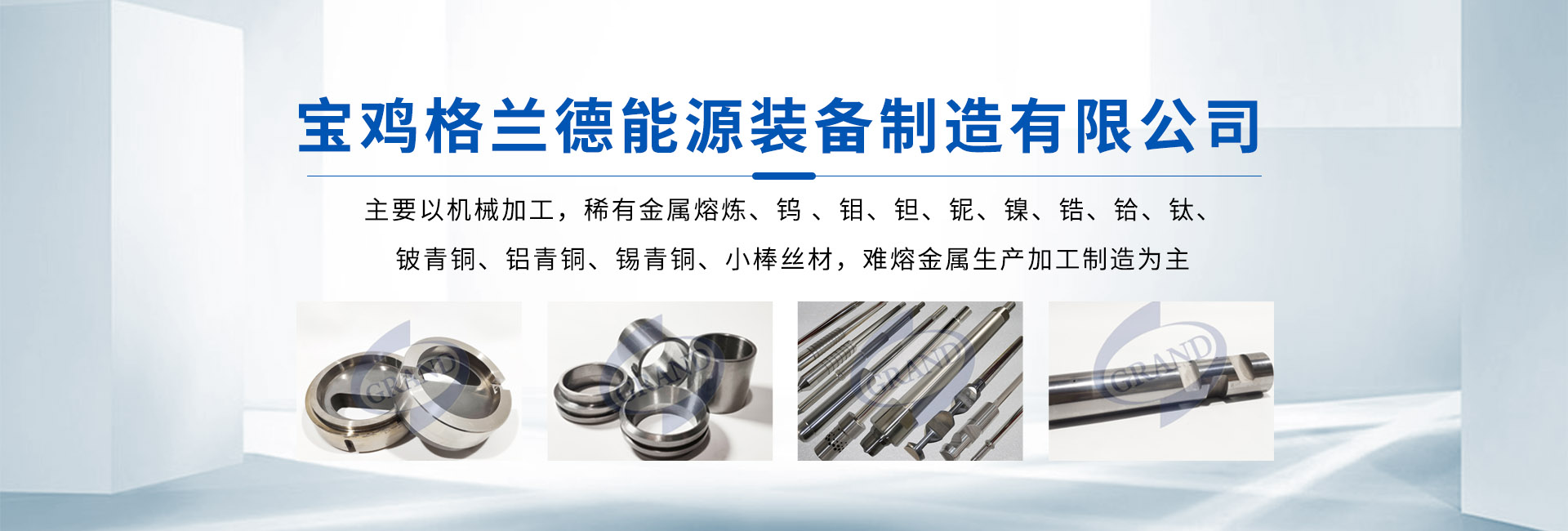 寶雞格蘭德能源裝備制造有限公司坐落于中國鈦都——寶雞,公司依托寶雞稀有金屬倉儲,主要以機械加工,稀有金屬熔煉,鎢 ,鉬,鉭,鈮,鎳,鋯,鉿,鈦,鈹青銅,鋁青銅,錫青銅,小棒絲材,難熔金屬生產加工制造為主,公司在深加工領域有先進的多元化設備,為國內外多家國有企業、上市企業提供板材、棒材、薄材、異形件等提供多元化加工服務。        寶雞格蘭德能源裝備制造有限公司近年來不斷完善配套產業,為提高產品市場競爭力,先后成立精加工事業部,稀貴金屬事業部,鈦材料事業部,鍛造事業部,鈑金焊接事業部,熱處理事業部,···